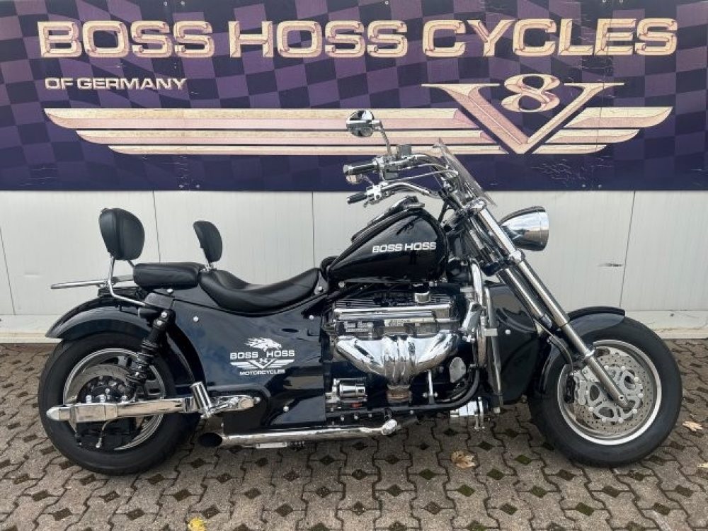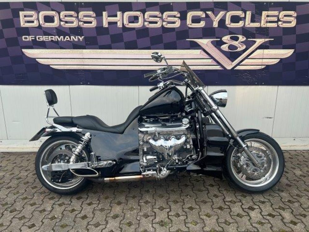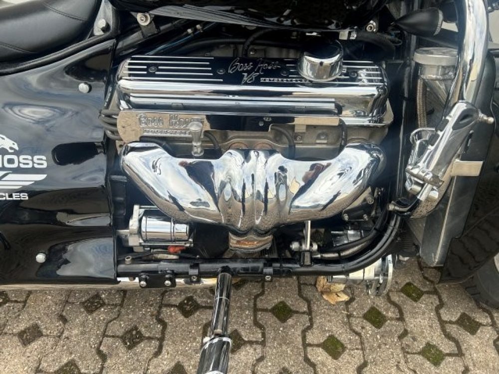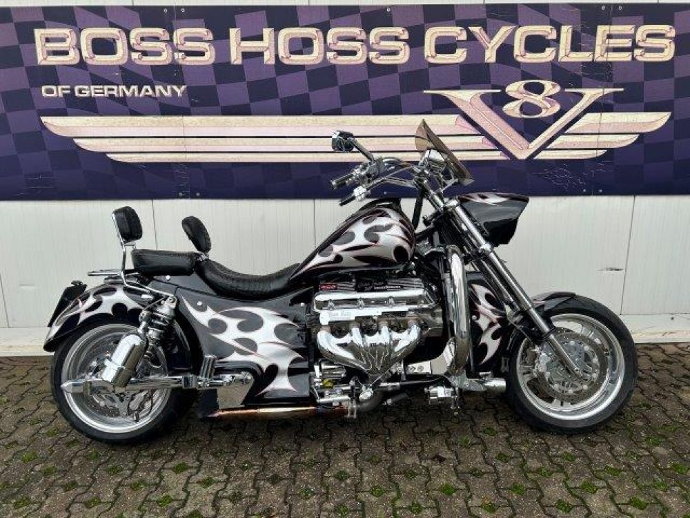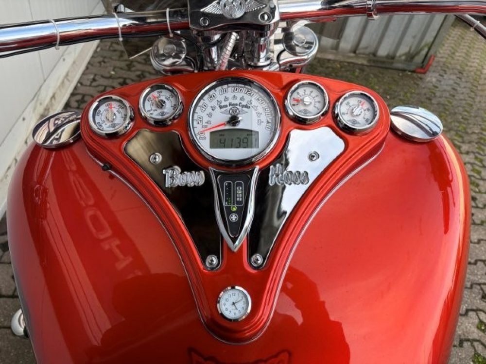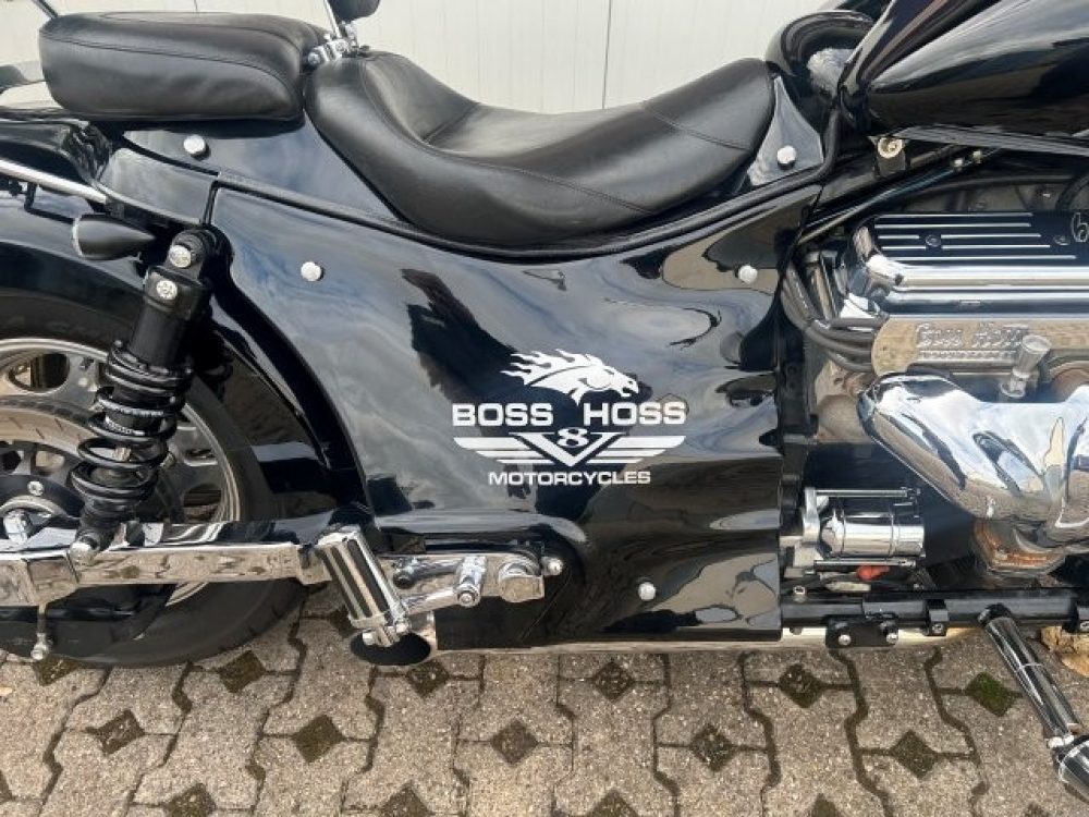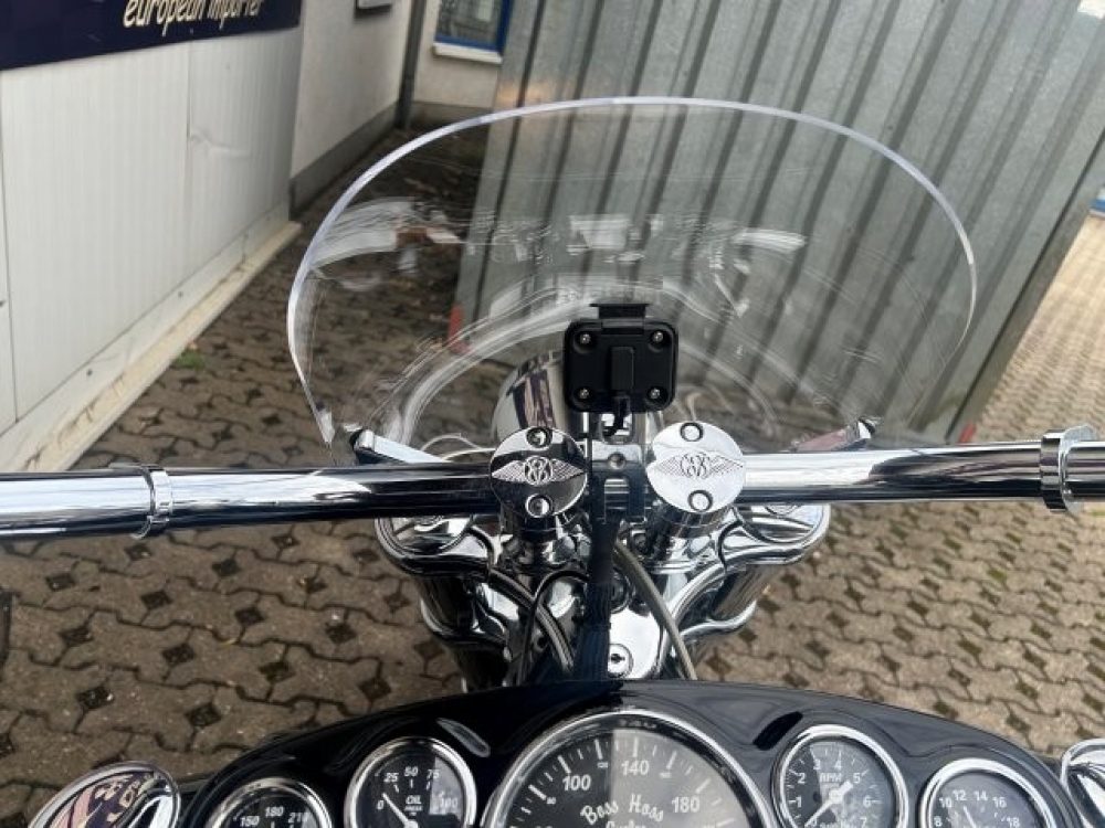 Besonderes: Blinker hinten und vorne LED mit Rücklicht, FAST Einspritzanlage, Winters Getriebe, Hyperpro Stoßdämpfer, , Sidepipes mit Schalldämpfern, Sissy Bar mit Luggage Rack und Boss Hoss Emblem, Beringer Bremszylinder links für Bremse hinten, Beringer Bremszylinder rechts für Bremse vorne, Kennzeichenhalter seitlich, Jockey Shifter chrom, Highway Pegs, Windvest Windschild und Großes Windschild, Garmin Navigation, Crash bars chrom, Fender vorne und hinten gekürzt.