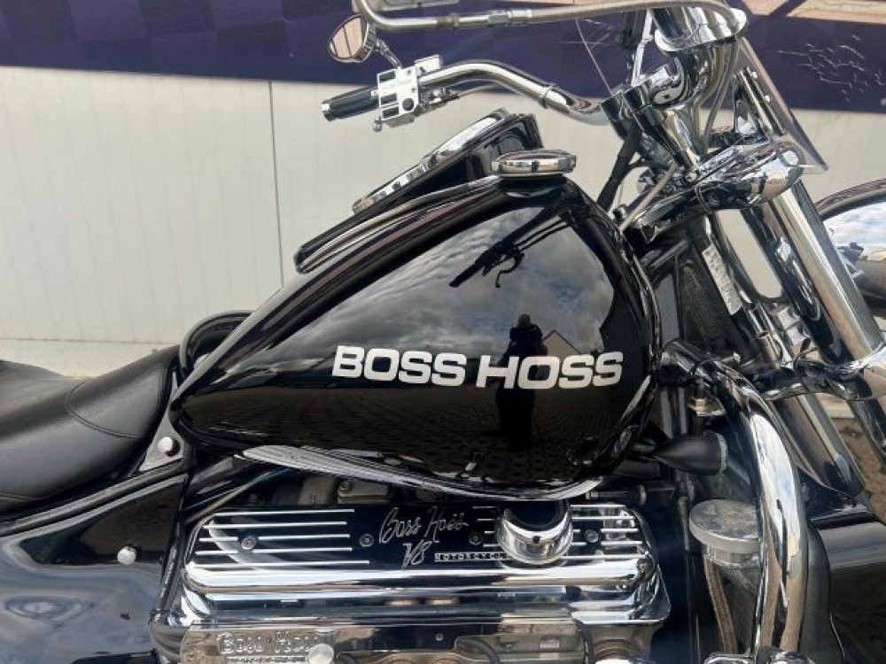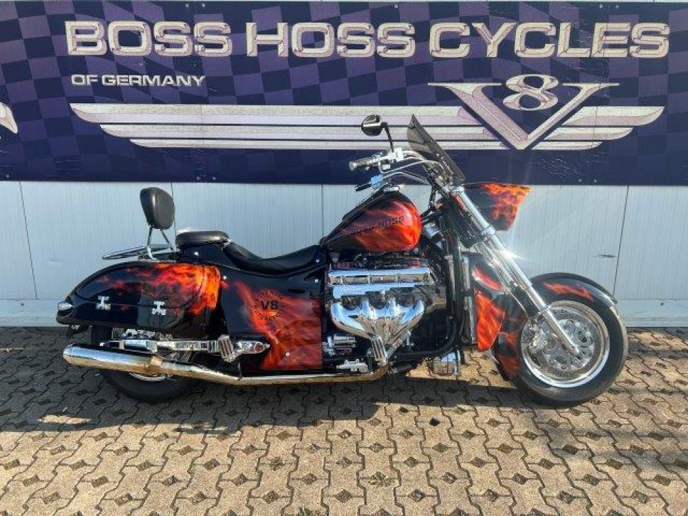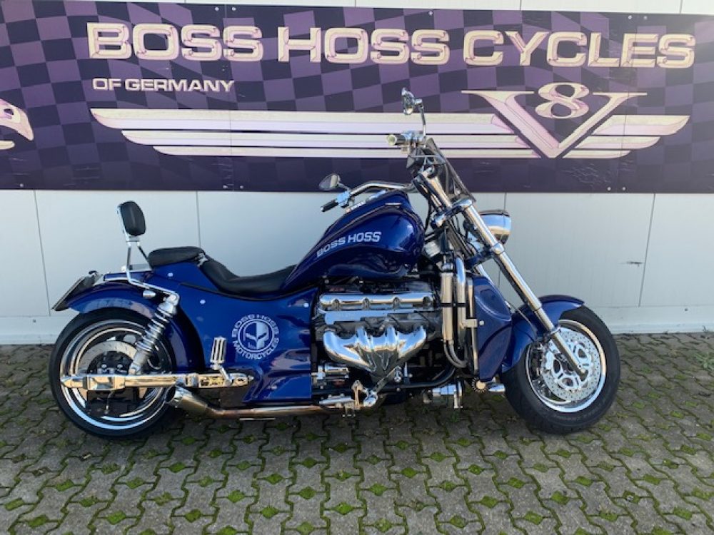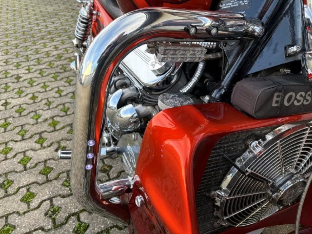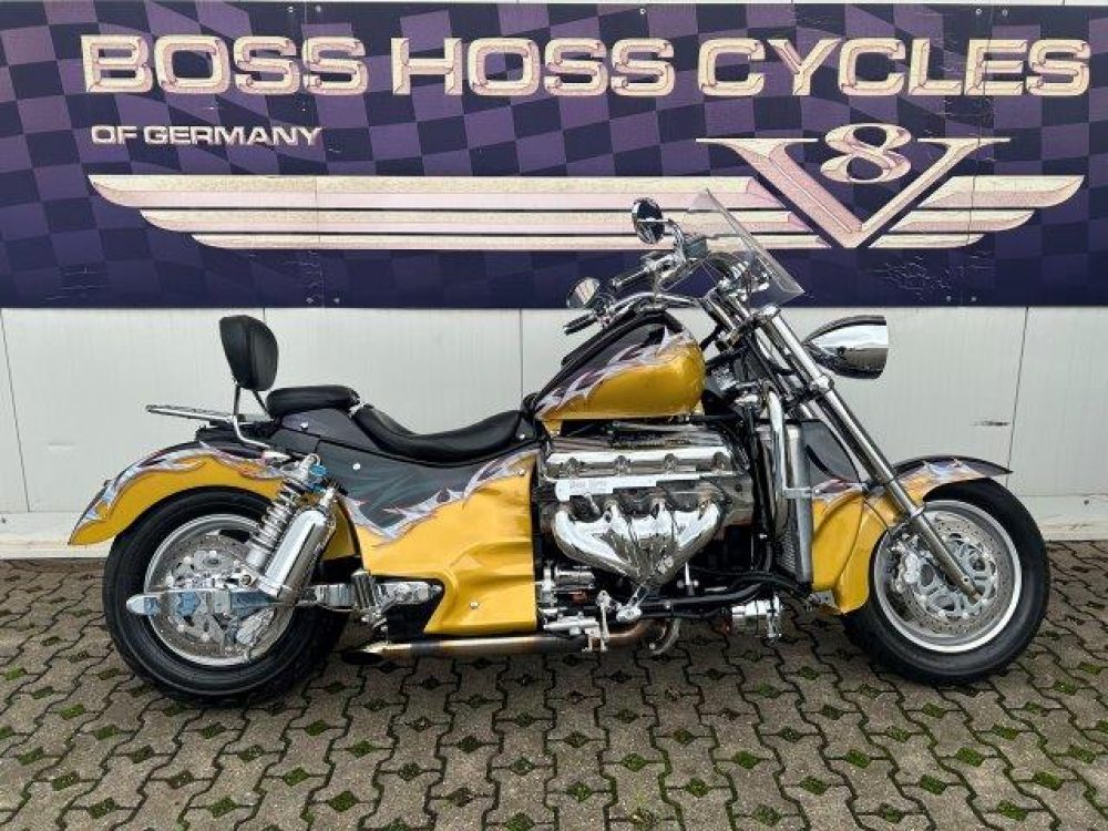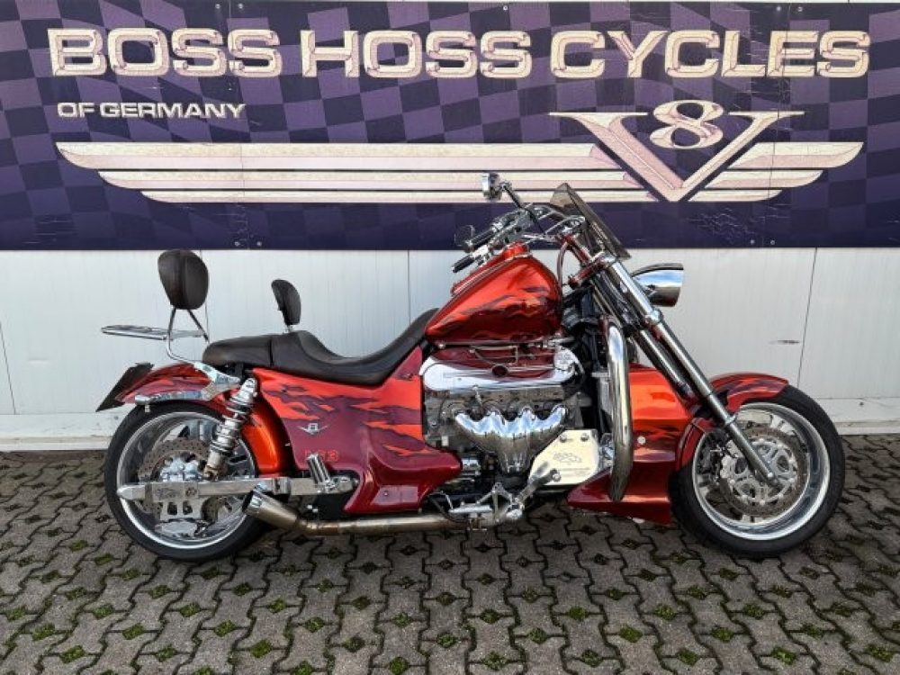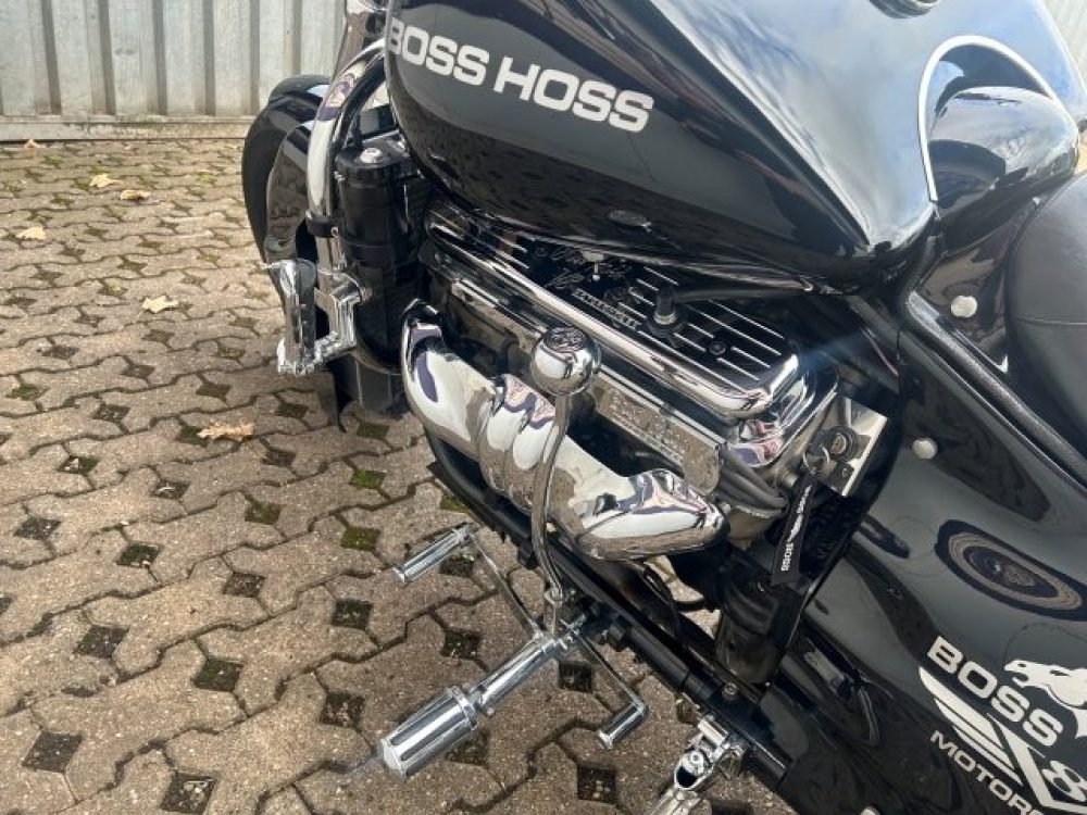 Besonderes: Blinker hinten und vorne LED mit Rücklicht, FAST Einspritzanlage, Winters Getriebe, Hyperpro Stoßdämpfer, , Sidepipes mit Schalldämpfern, Sissy Bar mit Luggage Rack und Boss Hoss Emblem, Beringer Bremszylinder links für Bremse hinten, Beringer Bremszylinder rechts für Bremse vorne, Kennzeichenhalter seitlich, Jockey Shifter chrom, Highway Pegs, Windvest Windschild und Großes Windschild, Garmin Navigation, Crash bars chrom, Fender vorne und hinten gekürzt.