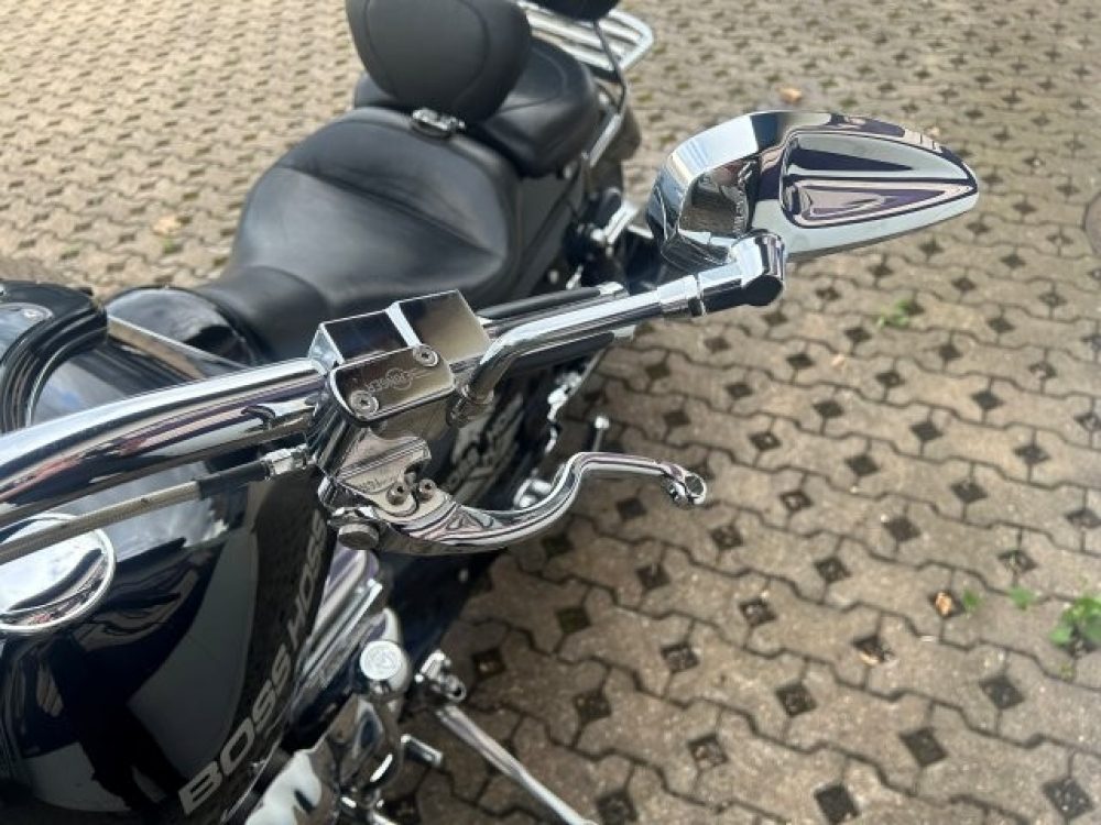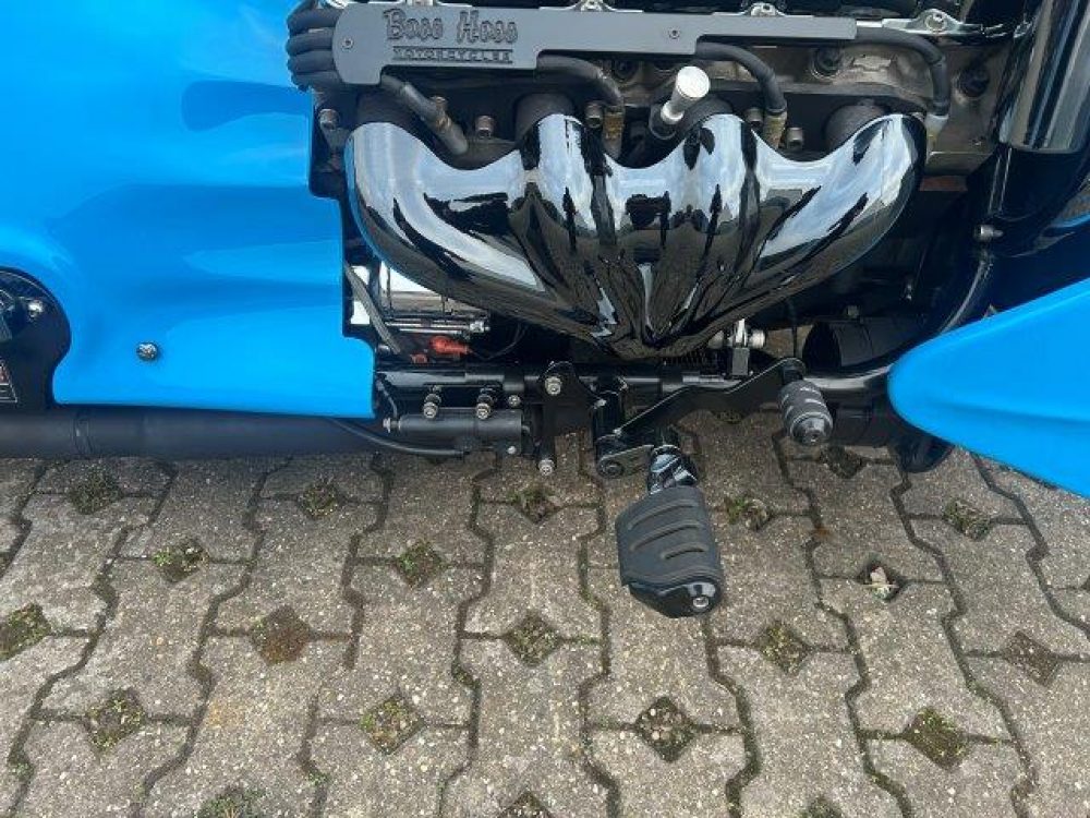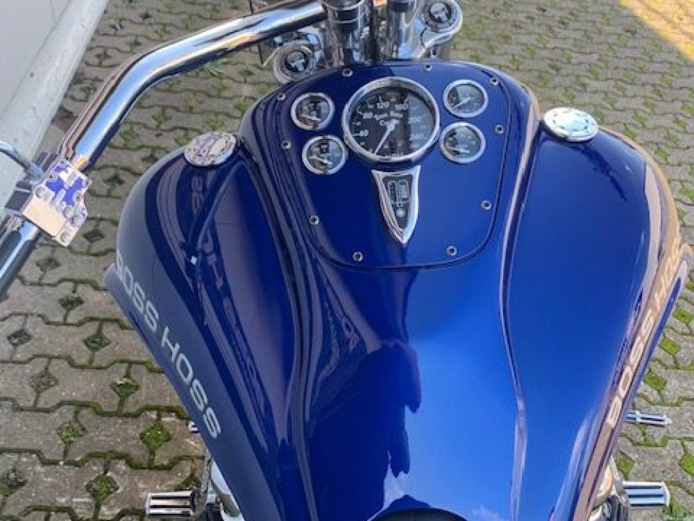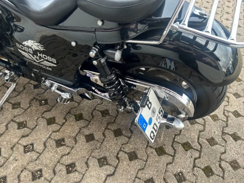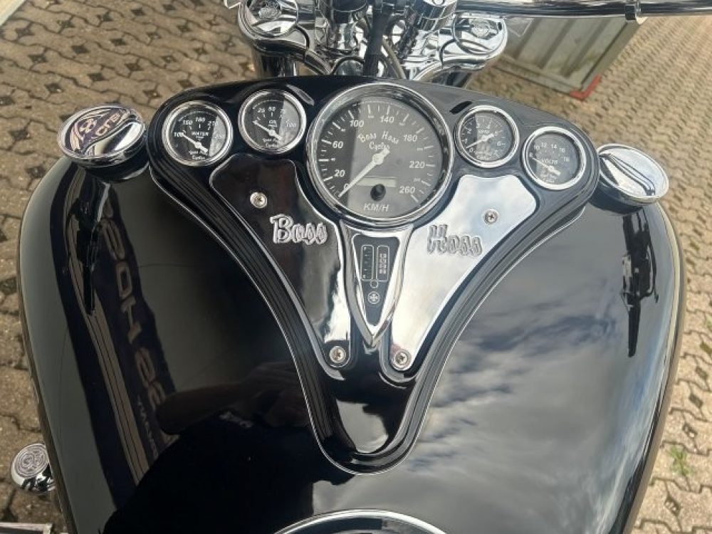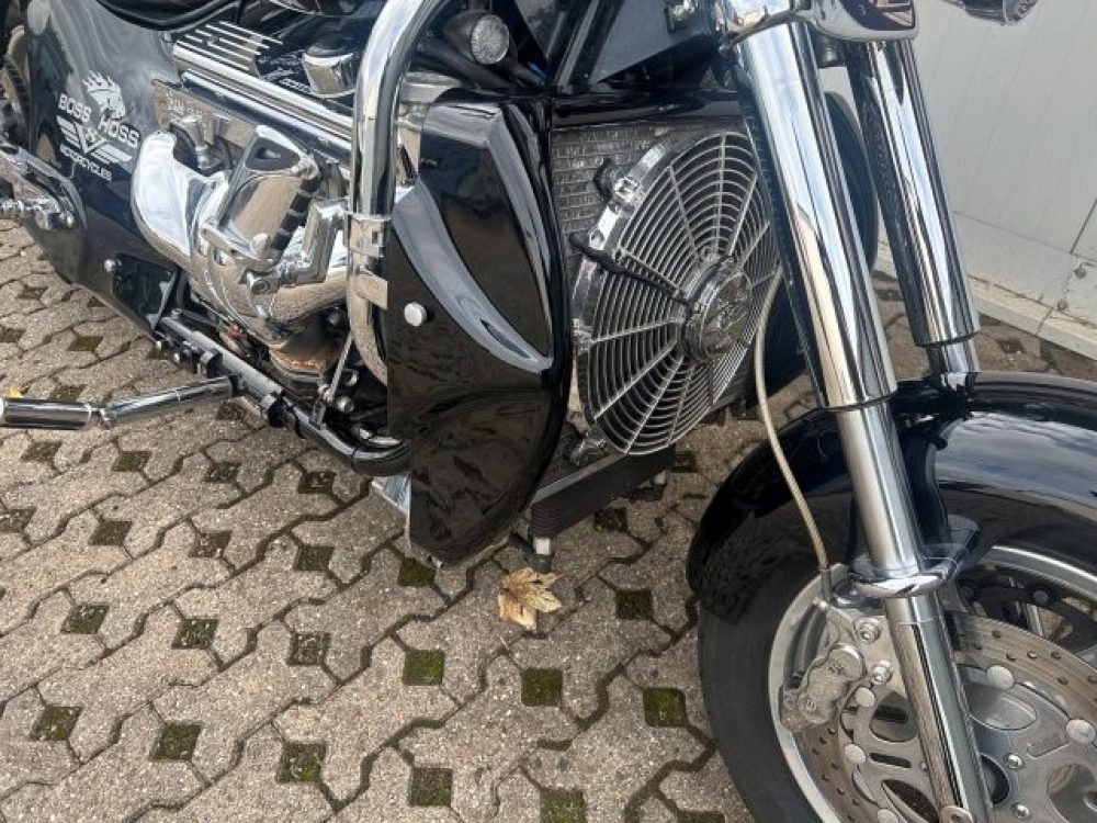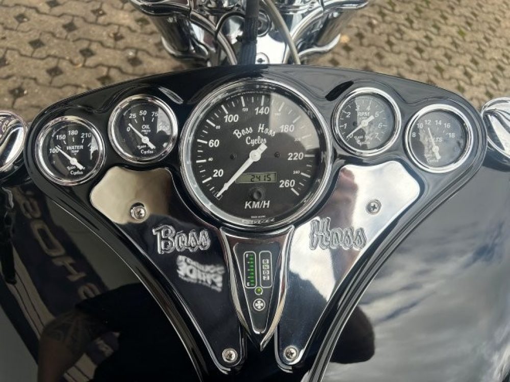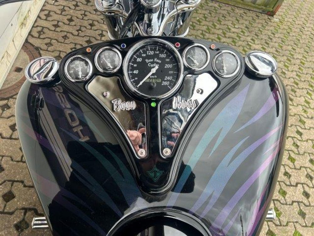 Besonderes: Frontfender Boss Hoss Concepts, Kühlerverkleidung Boss Hoss Concepts, Seitendeckel Boss Hoss Concepts, Custom Tank, Motogadget Motoscope in Riser eingelassen, Drag Bar, Kewl Metal Frontend, Scheinwerfer Custom CNC, Auspuff von Modell ab 2008 mit Kat und Schalldämpfer, Custom Pulley hinten, Alle Chrom Teile schwarz Verchromt.