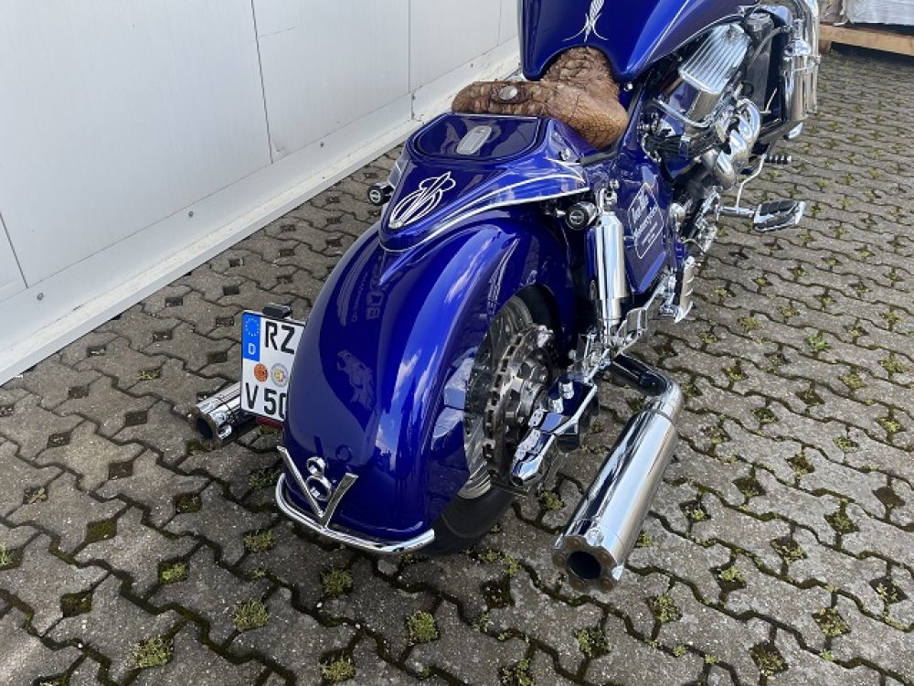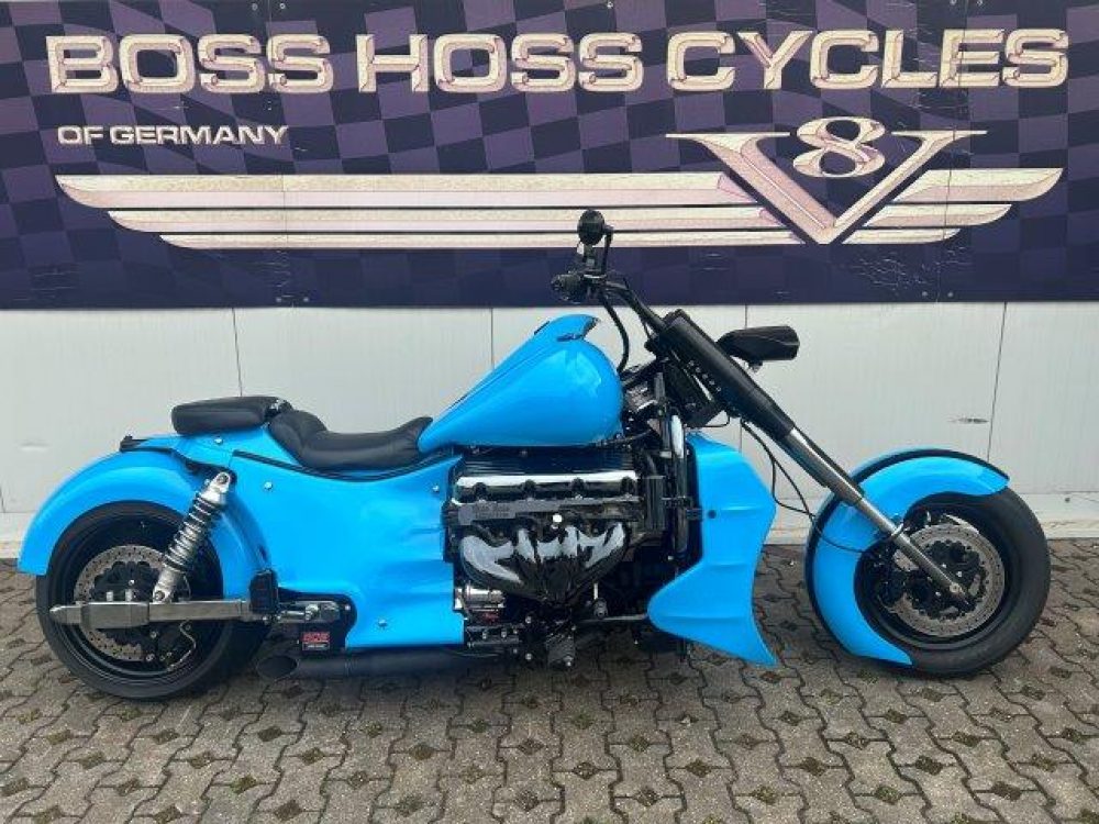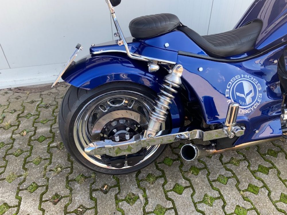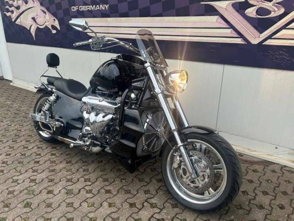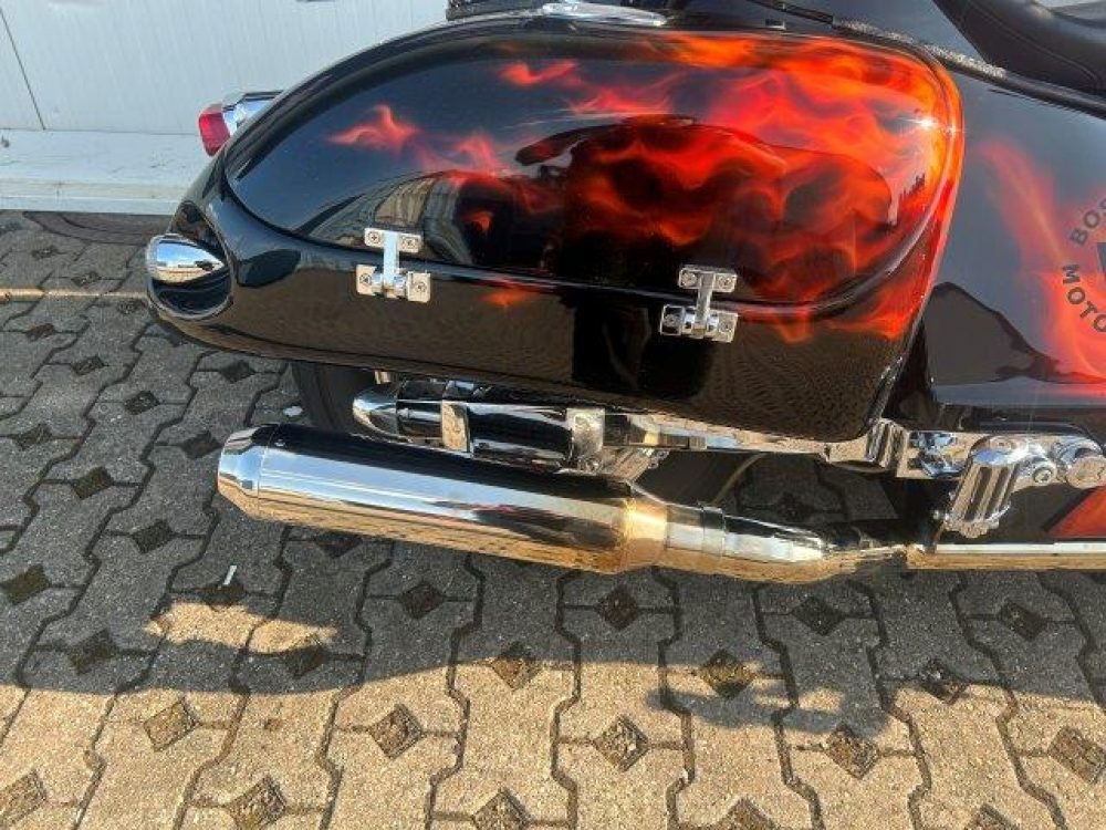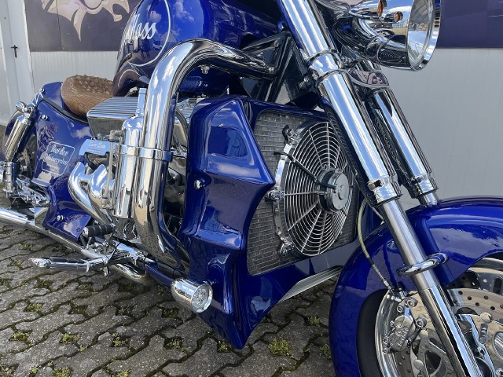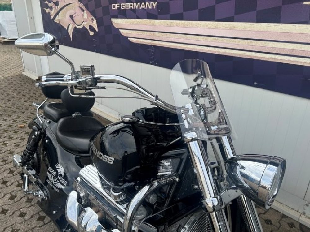 Besonderes: Frontfender Boss Hoss Concepts, Kühlerverkleidung Boss Hoss Concepts, Seitendeckel Boss Hoss Concepts, Custom Tank, Motogadget Motoscope in Riser eingelassen, Drag Bar, Kewl Metal Frontend, Scheinwerfer Custom CNC, Auspuff von Modell ab 2008 mit Kat und Schalldämpfer, Custom Pulley hinten, Alle Chrom Teile schwarz Verchromt.