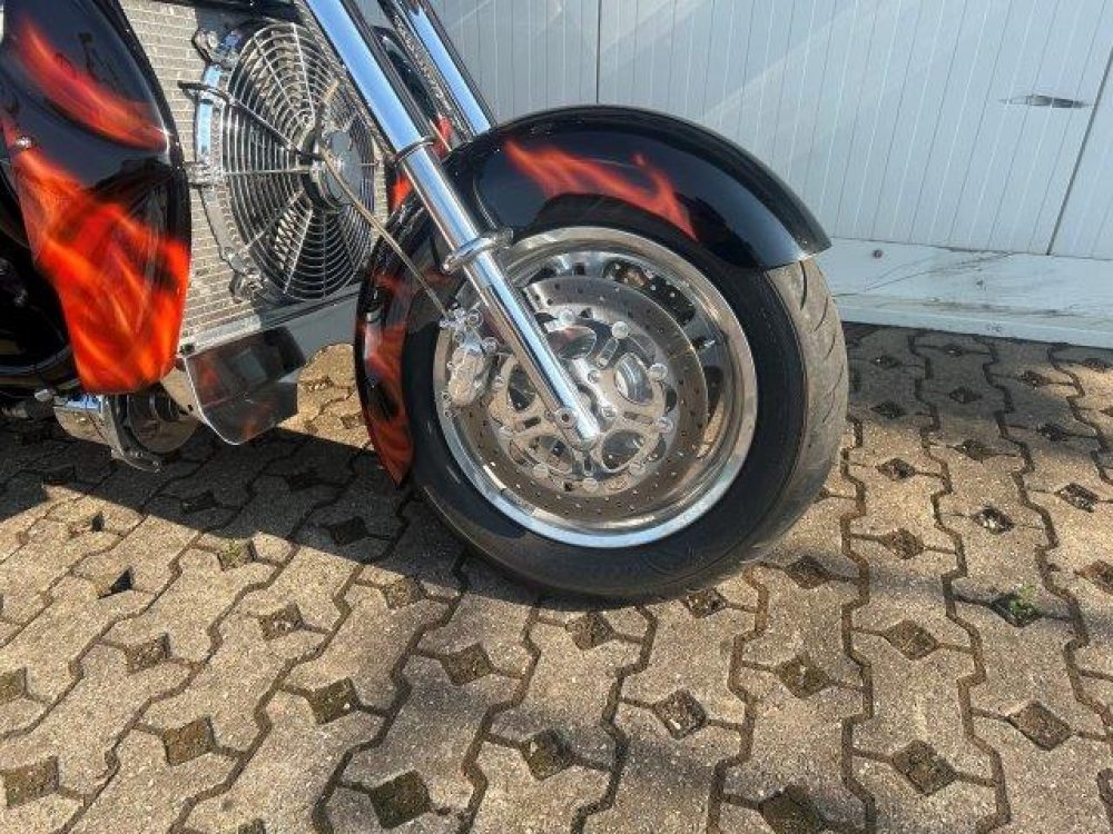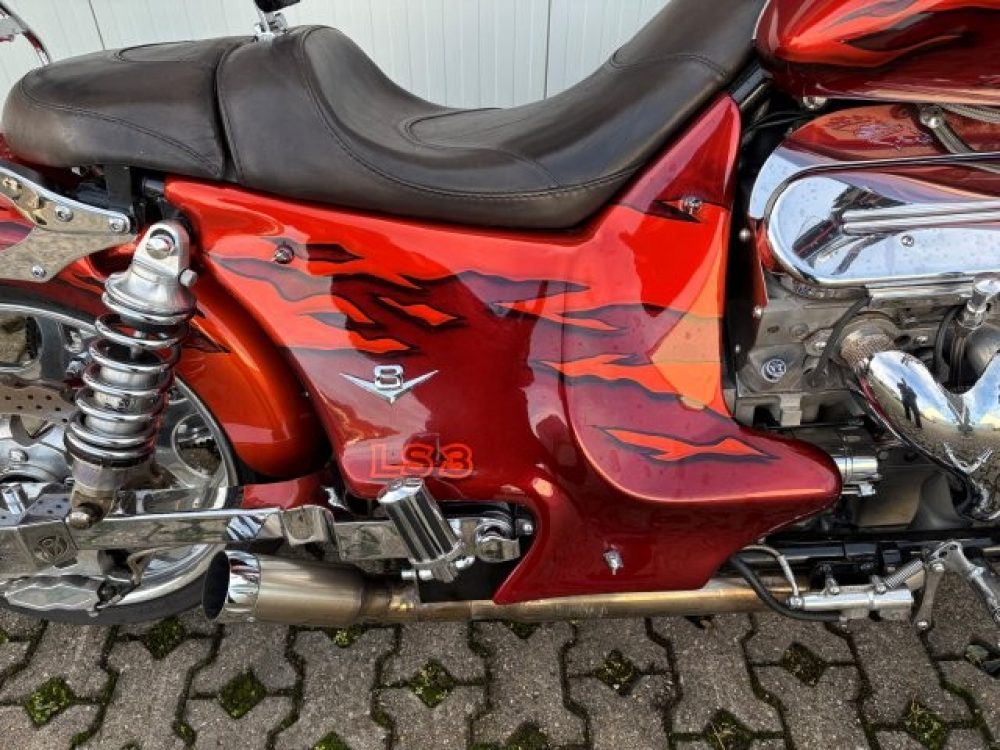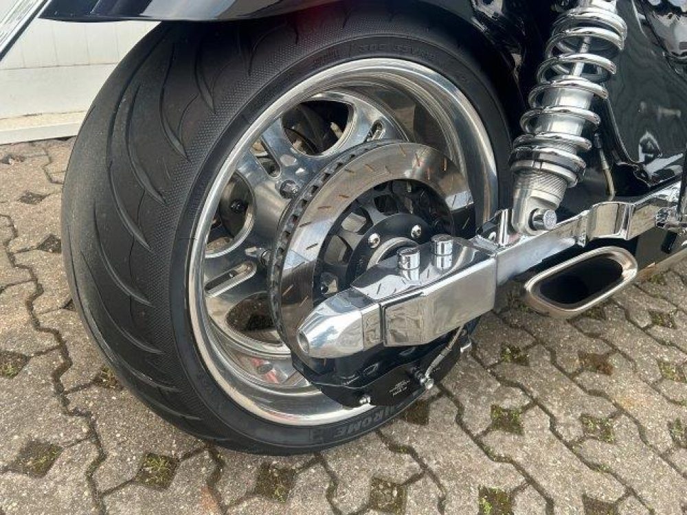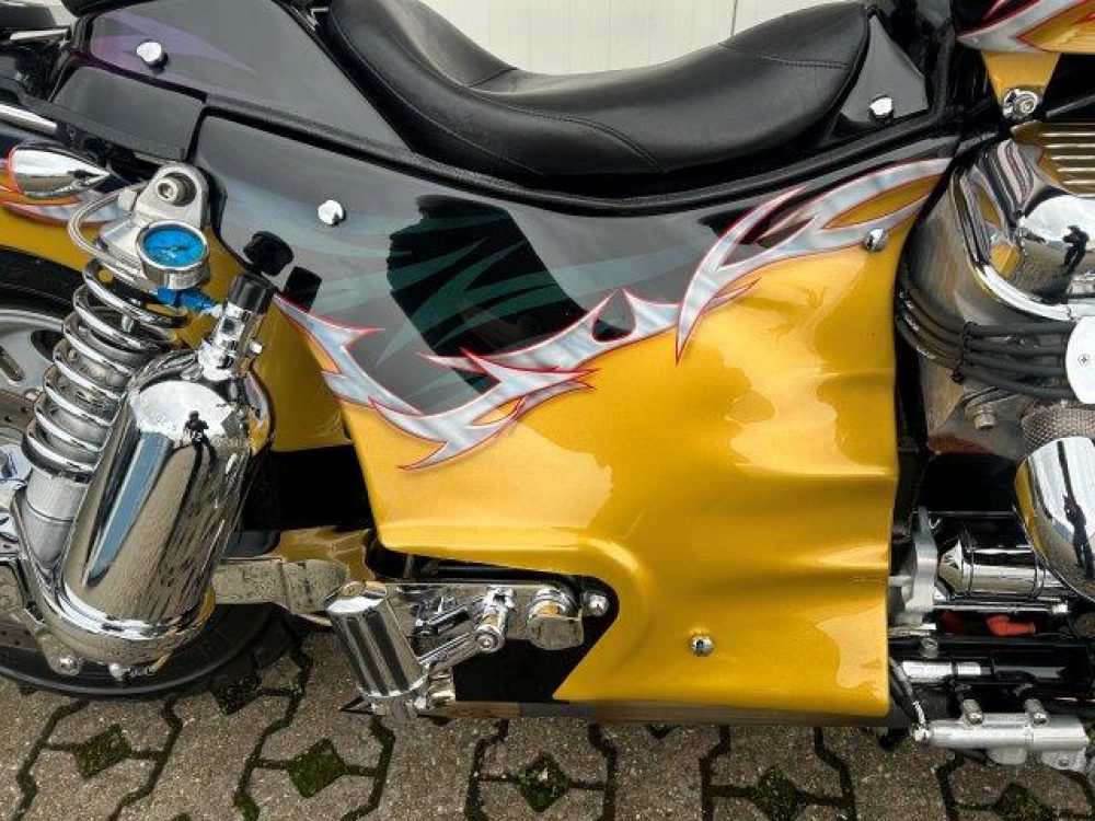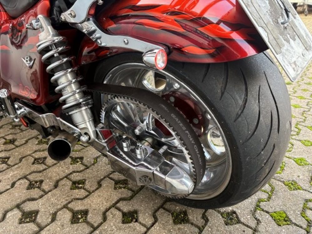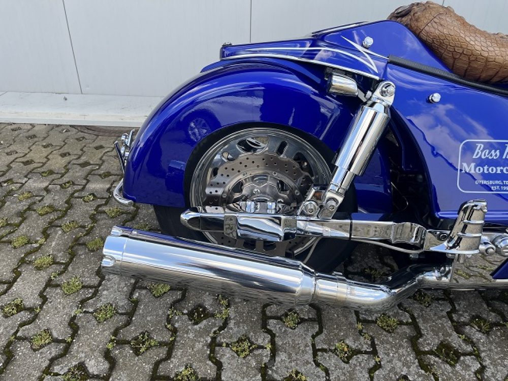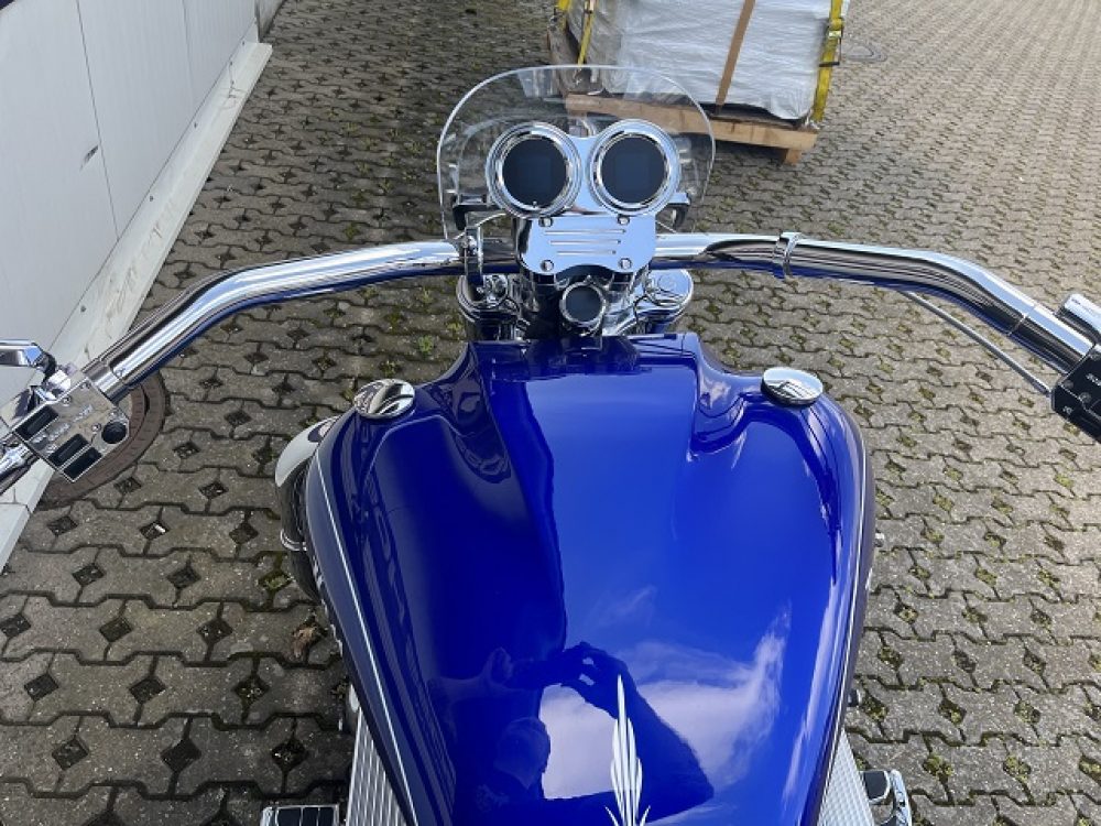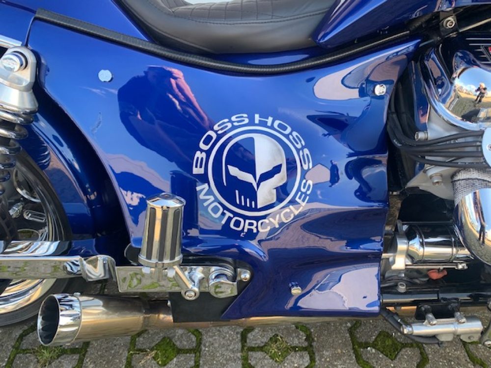 Besonderes: Frontfender Boss Hoss Concepts, Kühlerverkleidung Boss Hoss Concepts, Seitendeckel Boss Hoss Concepts, Custom Tank, Motogadget Motoscope in Riser eingelassen, Drag Bar, Kewl Metal Frontend, Scheinwerfer Custom CNC, Auspuff von Modell ab 2008 mit Kat und Schalldämpfer, Custom Pulley hinten, Alle Chrom Teile schwarz Verchromt.