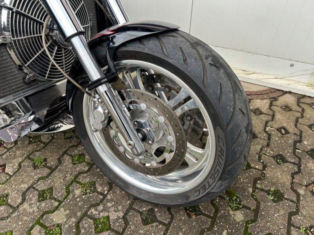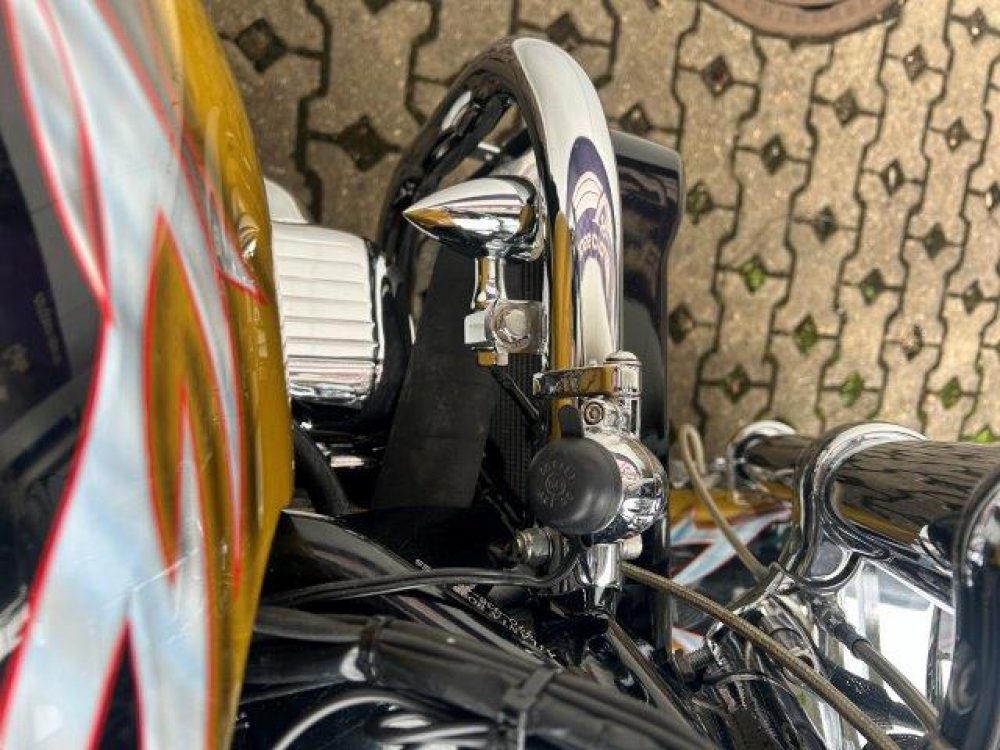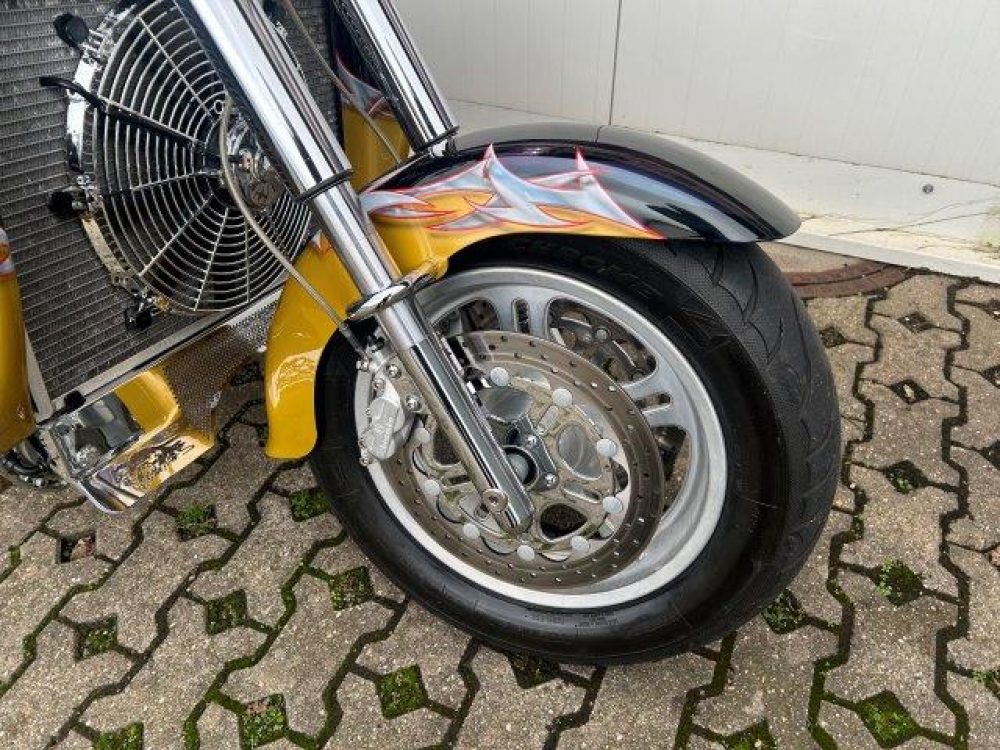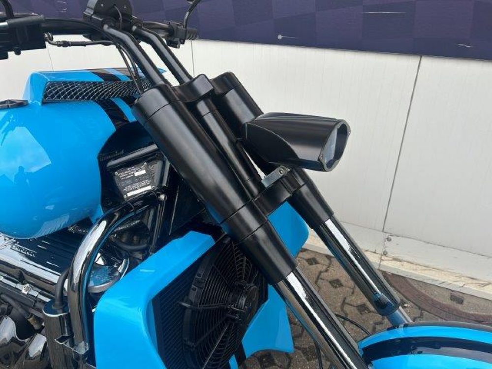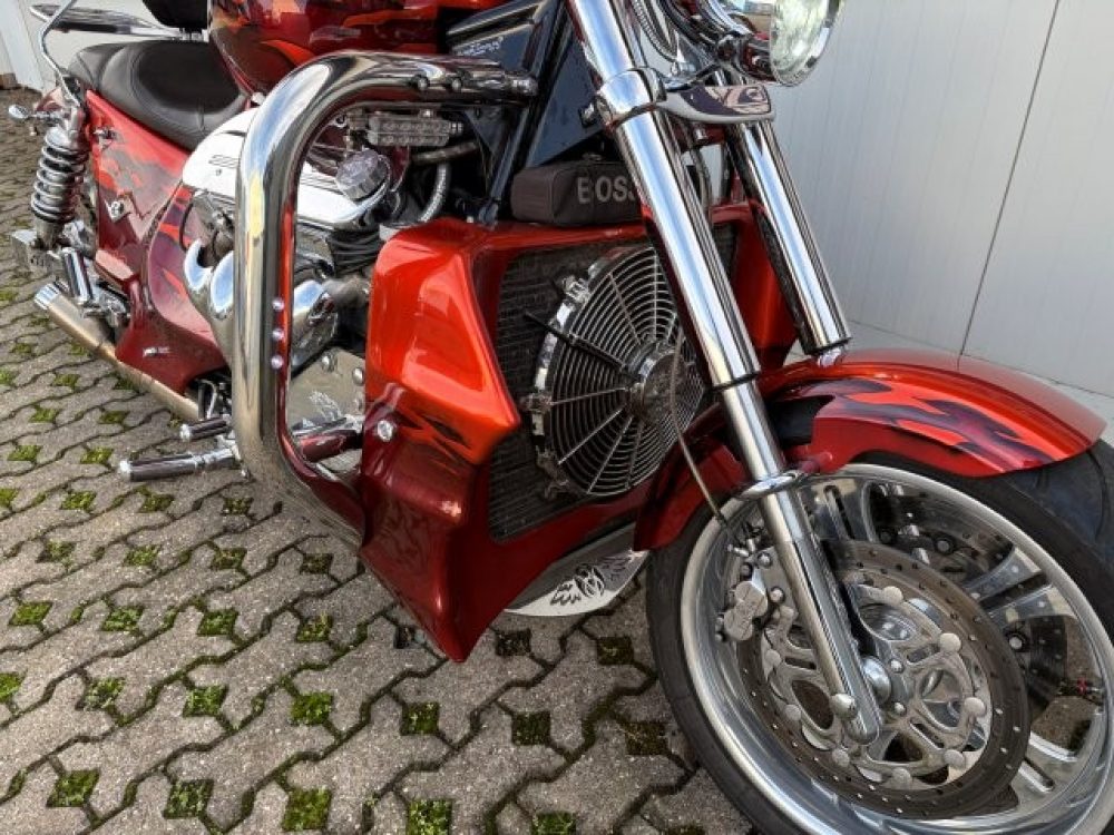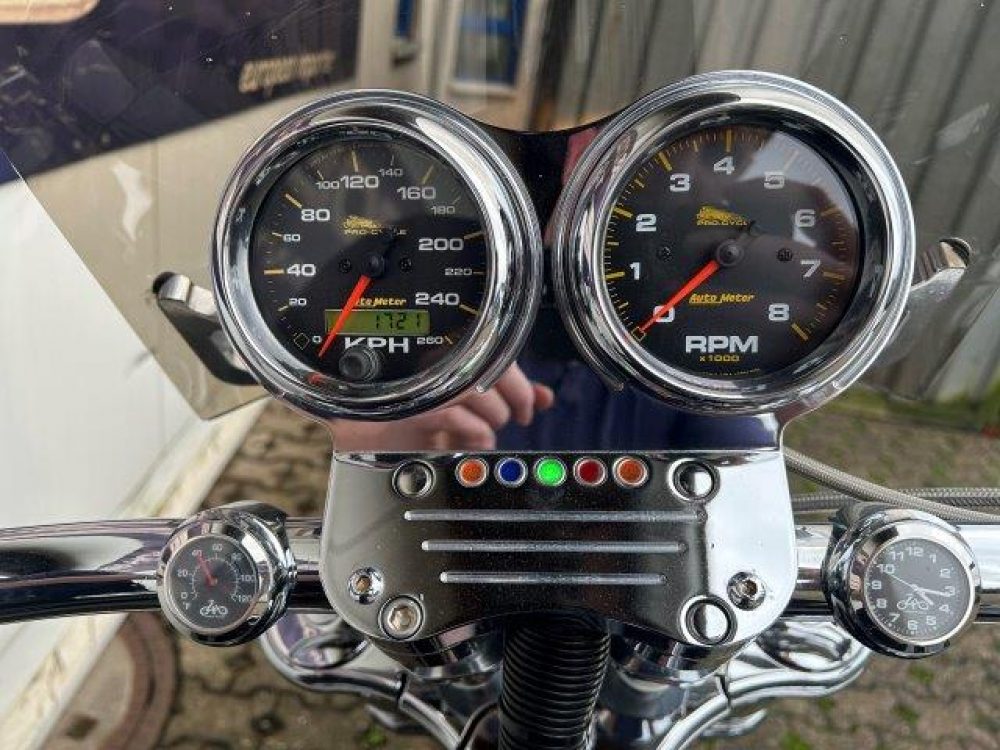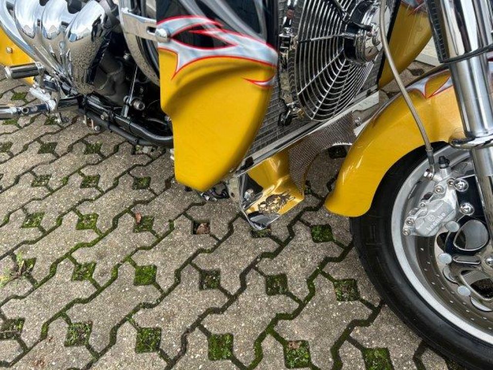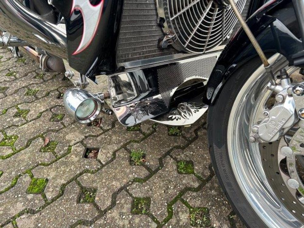Besonderes: Kühler Ausgleichsbehälter, Custom Ventildeckel, Lower Airdam, Running Lights LED, Windvest Windschild, Sidepipes mit Kat und Schalldämpfer, Custom Auspuffendstücke, LED Blinker mit Rücklicht Kellermann, Kellermann vorne, Lenker 42mm inkl. Riser, Crash Bars Chrom, Custom Lampenhalter, Navihalter, Sitzbank Sonderanfertigung, Felgen Hochglanzverdichtet, Fender vorne und hinten gekürzt, Getriebeölkühler groß, Custom Tank, Sissy Bar.