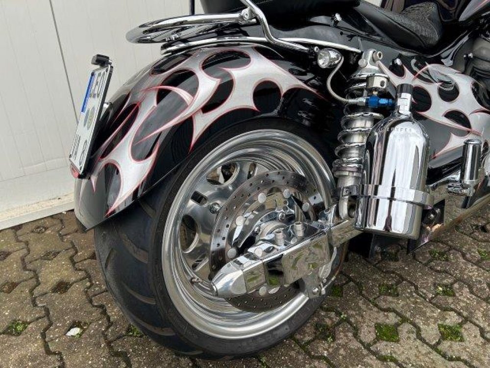 Besonderes: Blinker hinten LED mit Rücklicht, LED Blinker vorne, Windvest Windschild getönt, Lampenverkleidung,Sissy Bar mit Luggage Rack, Lower airdam mit Running Lights, Ram Air Stretch Tank, Crash Bars 60mm, NOS Flasche an Stoßdämpfer, Sidepipes mit Kat und Schalldämpfer, Sitzbank Sonderanfertigung, Spiegel mit Blinker, Zudsatz Getriebeöltank, Custom Pulley hinten.