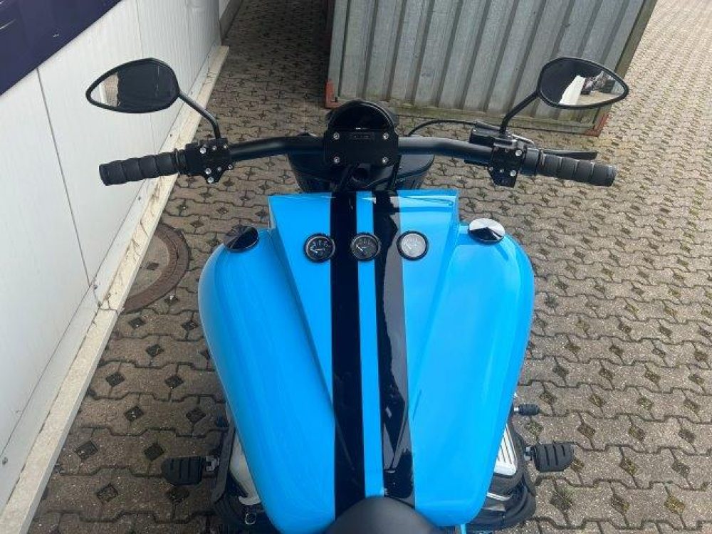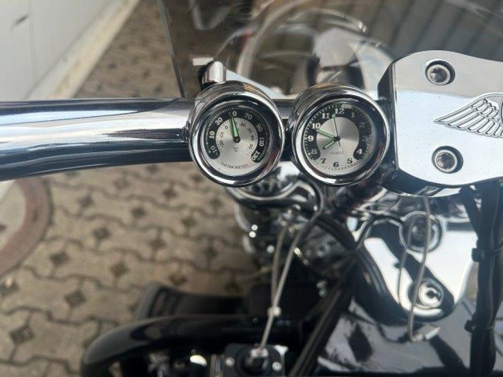 Besonderes: Sissy Bar, Windvest Windschild, Dash Inserts chrom, Blinker vorne und hinten LED, Custom Kühlerverkleidung, Custom Auspuffendstücke, Thermometer und Uhr am Lenker, Custom Tankdeckel, Custom Body Schrauben schwarz.