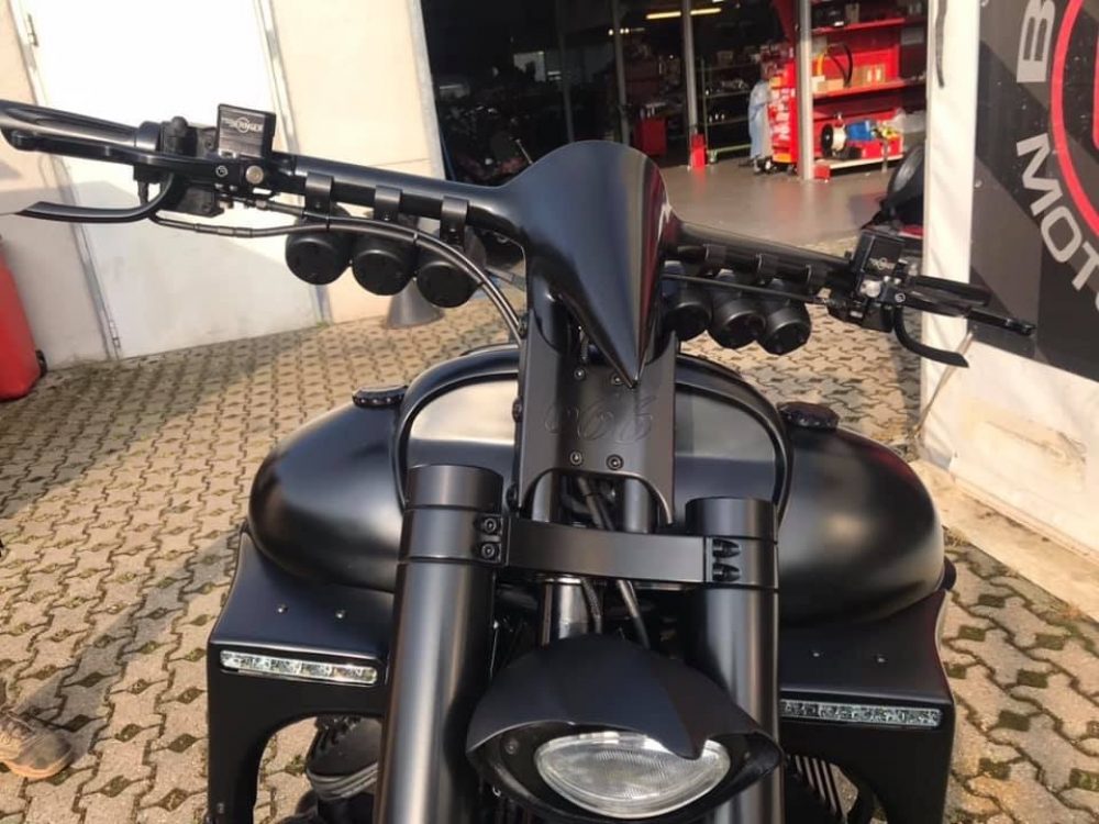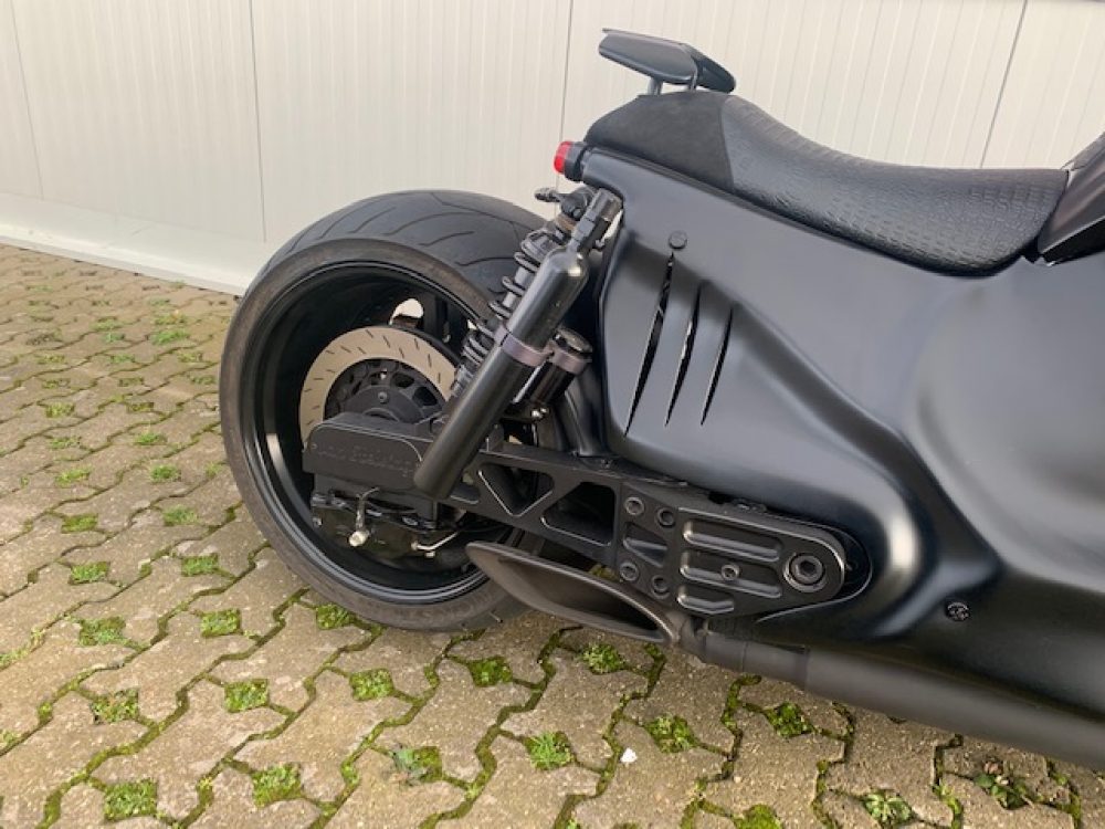 Besonderes: Kotflügel vorne Custom, Custom Gabel mit Top Deckeln Sonderanfertigung, Custom Carbon Scheinwerfer, Custom Lenker 38mm, Custom Tank, Tankdeckel Custom, Custom Ventildeckel, Rahmenblenden unten, Sitzbank Sonderanfertigung mit Krokoleder, Custom Seitendeckel, Custom Kühlerverkleidung, Spiegel Custom, Custom Auspuffendstücke AMG Style, Kennzeichenhalter seitlich Sonderanfertigung, Offene Auspuffanlage, Große Getriebeölwanne, Custom Pulley hinten, High Stall Converter, Hot cam, Hyper Pro Stoßdämpfer, Lachgasflaschen hinten an Stoßdämpfern, Beringer Bremszylinder für Vorderradbremse an Lenker rechts, Beringer Bremszylinder für Hinterradbremse an Lenker links, Custom Handschalthebel, Front und Heckkamera mit Display in Dash, Tagfahrleuchten LED inkl. Customverkleidung auf Crash Bars, Navi in Lenker eingearbeitet, Kontrolleuchten in Lenker eingearbeitet, Dakota Digital Armaturen an Lenker, Blinker vorne Kodlin an Crash Bars, Blinker hinten mit Rücklicht in Rahmen eingearbeitet, Heckrahmen gekürzt, Frontpulley 30 Zähne, Felgendesign mehrteilig 5 Spoke, Riserverkleidung sonderanfertigung, Custom Hinterradschwinge, Heckspoiler, M-Lock, Ness Deep Cut Grips, Luftfilterüberzug Peoplehater, Schaltergehäuse Sonderanfertigung Peoplehater, Custom Tank bis unten verschlossen, Salute Kickstand, Bike ist komplett schwarz lackiert und Kunststoffbeschichtet, Peoplehater Schriftzüge in Tank einpoliert.