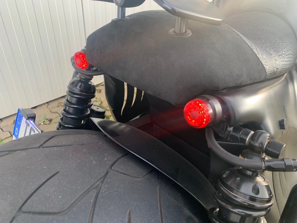Besonderes: Kotflügel vorne Custom, Custom Gabelbrücke, LED Scheinwerfereinsatz, Custom Lenker VA 40mm, Blinker vorne und hinten LED, Crash Bars Chrom, Custom Tank, Tankdeckel Custom, Custom Ventildeckel verchromt, Rahmenblenden unten verchromt, Custom Seitendeckel, Custom Kühlerverkleidung, Windvest Windschild, Custom Auspuffendstücke, Kennzeichenhalter seitlich, Zylinderkopfblenden Chrom, Sissy Barmit Luggage Rack, Seitenständerkeil, Große Getriebeölwanne, Custom Pulley hinten verchromt (75 Zähne), Zündschlossplatte verchromt, Hyper Pro Stoßdämpfer, Custom Schwinge.